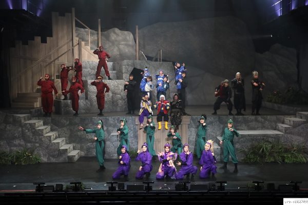 忍ミュと言えば劇場はシアターGロッソ、他の劇場と比較するととにかく高い天井、それを生かした舞台、アクション、殺陣、高いところから飛び降りたり、急な階段を駆け上ったり、宙返りしたり、この難易度の高い動きは見どころ。そしてもちろん、バッドエンドにはならないのはお約束。また、謎の忍者集団・クモタケ忍者隊はミュージカル版のオリジナル。アニメを視聴しているなら、そこの違いも楽しめるはず。最後は、いつもの歌を歌い、また、通路を使った演出も頻繁に。2時間15分ノンストップ、東京は26日まで。