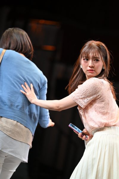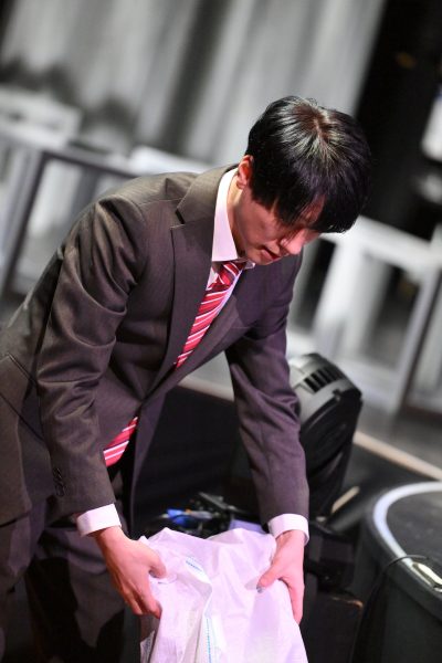 さらに客席も演出の⼀部として巧みに取り込まれており、観客⾃⾝が物語の⽬撃者として存在しているような感覚を覚える。舞台と客席、 キャストと観客の境界があいまいになり、劇場そのものが物語の空間となる瞬間に⽴ち会うことができる。