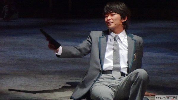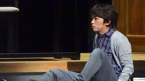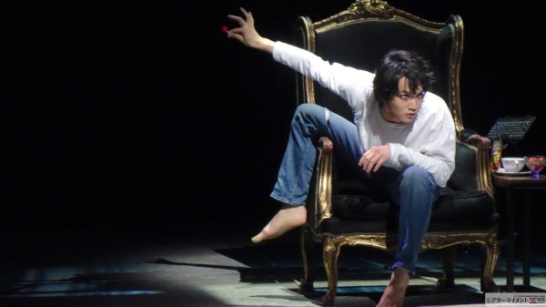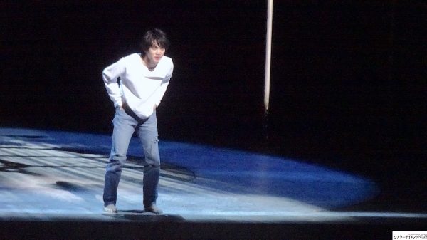 またLの独特の姿勢、この体勢で歌唱というのはかなり難易度が高そう。「座り方はもうね、普通に歌えなくなってきた」と三浦宏規が笑いを誘う。そして「楽ではないですね。でも慣れちゃいました」とコメント。さらにテニスのシーンがあるが、この姿勢で!ここは見どころ。またLは裸足。もうすぐ12月だが…。「末端冷え性なんですよ、すごく。今日ぐらいはスリッパ履きたかった」とコメント。