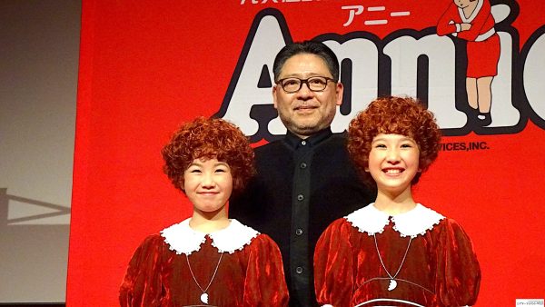阿部社長もおっしゃいましたけどもね。武力衝突がこの21世紀に起こるんだと思ってたのに、それが広がる一方ですよね。世界中で、いろいろなところで対立や断絶が起こっている驚くような10年だなと。実は『アニー』がブロードウェイで1977年に上演される前の年、トライアウトといって地方の都市で作品を上演しながら改定していき、作品の精度を上げることをするのですが、コネチカット州にあるグッドスピードオペラハウスという劇場がトライアウトをやりましてそれがちょうど今年50年目になるんだそうです。それを記念して今年の秋から年末にかけて、50年ぶりに『アニー』を上演というおめでたいニュースも。50年前に生まれたとき、ベトナム戦争が泥沼化していて、社会的対立、世の中疲弊、ネガティブなことがたくさんあった時代だったと思うのですが、その中で楽観主義的な作品、『アニー』が必要だと思ったこの作品の作者たちがいるんだなと思うんです。楽観主義のアニー、ウォーバックスという大人それこそ利己主義的で、このウォーバックスがどう変わっていくのか、ご覧になる方にとっては何かしらの意味を持つ、そういう作品だと思います。社会のことを声高に何か批評することは決してないんですけど、この明るく無邪気な作品が持つその明るいメッセージ、前向きなメッセージ、これをご覧になった方々一人一人の中に根付いて、世の中をより良くするように前向きな姿勢を持ってくださったら嬉しいかな。そんなつもりで取り組んでいます。あと、今年の製作発表にはサンディが登壇します。”3人”の評価が高かったら来年以降はサンディだけで製作発表も考えてもいいかな(笑)」と語った。