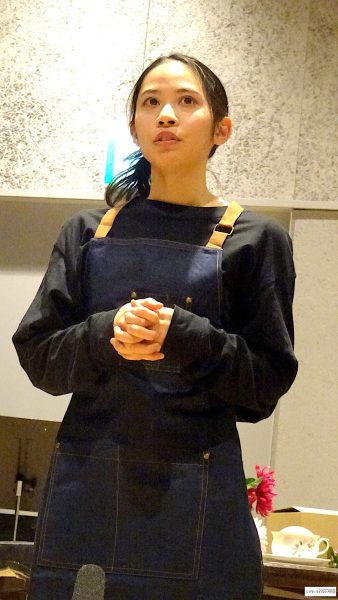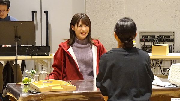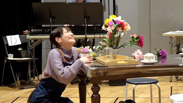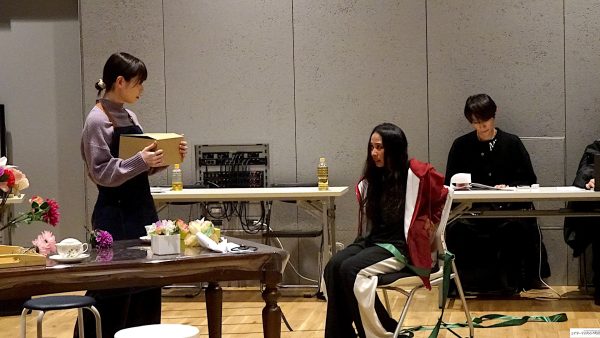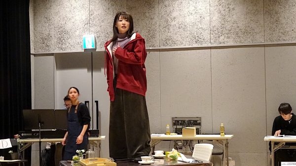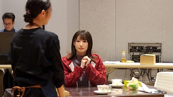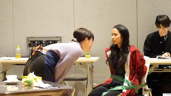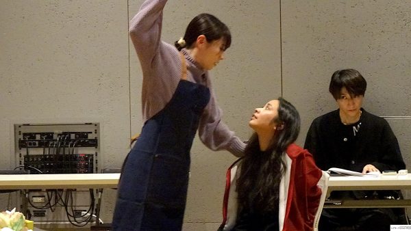最初に場面披露。稽古場の床に貼られているテープ、実際の舞台のスペース、実はかなり狭い。中央にテーブル。二場の再会のシーン、花屋で働く白椿蒼(屋比久知奈)の元に母親殺しの刑期を終えた白椿紅(唯月ふうか)がやってくる。