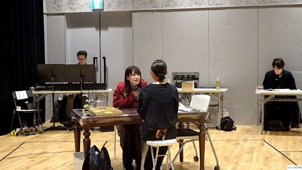 また、屋比久知奈は「無意識に、劇場のときの呼吸というんでしょうか、歌とか。視線とか、体の方とかが、もしかしたらすごく意識的に変えてるわけではないんですけど、違うのかなっていうのがあって。この稽古場で最初来て思ったことは舞台って真っ暗になるから、結構集中しやすいし、割と没頭しやすいんですけど、ここに立ったときに、それがすごく難しい。人が近くにいることで人を感じる。うん。大劇場でも、もちろん人のエネルギーは感じるんですけど…すごく独特の空気感があるけれども溶け込むの方が近いのかな?人を感じるからこそ、私もやってる身として嘘つきたくないし、つけないなと」そして、唯月ふうかは「リアルすぎてはいけない…その塩梅がすごく難しいなって今回思って。出すのは引くよりも簡単とは違うけど…引き取りってマイナスするのってすごい難しいことだなと思って、その塩梅が今も苦戦してる最中なんですけどそのバランスを外に放出するうちに溶け込むというか、そのバランスがやっぱりもっともっと小さい、この空間で考えなくちゃいけないことなんだなっていうのは1つ学びました」とコメント。