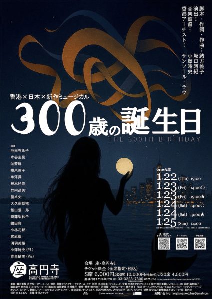 香港と日本在住の演劇人が文化の違いを超えて舞台を共同制作する唯一のプラットフォーム。今まで見たことのないミュージカルを、お客様の心に届けたいと願いながら活動中。演劇による国際文化交流を推進するために、2025年は座・高円寺による子ども向けのワークショップ「香港からこんにちは~影絵をつなごう!~」、俳優とのワークショップ、創作過程をお客様にも体験していただく『300歳の誕生日・新曲お披露目ライブ』等を実施した。