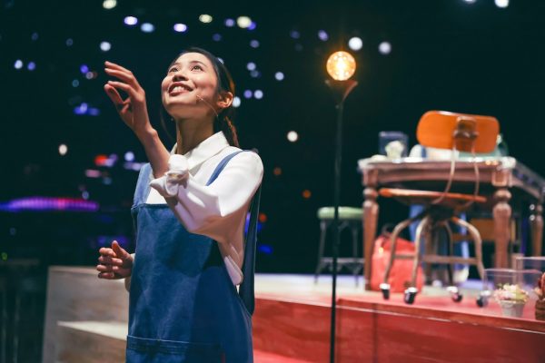 明快なオーバーチュアーはなく、時間になり、キャストが登場、といっても2人だけ。最初に登場するのは白椿蒼(屋比久知奈)。場所は花屋の裏、つまりバックヤード。花屋の店員としての仕事をテキパキとこなす。木に霧吹きをかけたり、客席全体が花屋、観客が座っているすぐそこに花屋の棚があったりする。天井にはプリザーブドフラワー。歌、就職のきっかけとなった出来事、「運が良かっただけ」と謙遜。ピアノの調べが印象的。「お疲れ様です」同僚が帰る音、音だけで登場はしない。電話、なんということもない会話、彼女の日常が綴られる。実は彼女は双子、もう一人、姉妹がいる。チャイムが鳴る、白椿紅(唯月ふうか)、オレンジのパーカー、白いブラウス、黒のスニーカー姿というラフな出立ち。対する白椿蒼は仕事着であるエプロン、白いシャツ、黒いパンツ姿、動きやすい服装。彼女も黒いスニーカーを履いている。「久しぶりだね」手土産のクッキーを蒼に渡す。紅茶を入れる蒼。