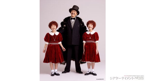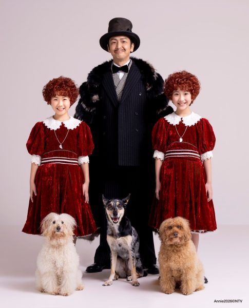 この度、岡田浩暉扮する新ウォーバックスと、2026 年のアニー2 名、そしてアニーの“相棒”サンディ役を務める 3 匹のわんちゃん達による心温まる扮装写真が公開。
