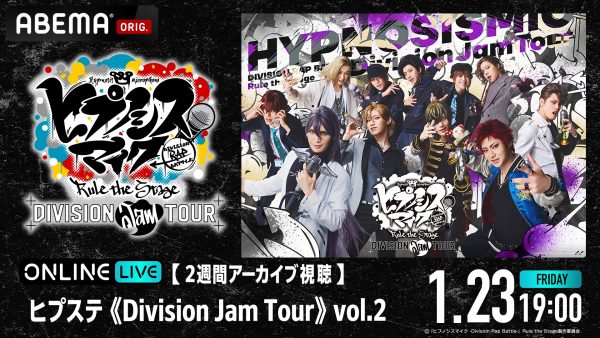 新しい未来のテレビ「ABEMA」は、『ヒプノシスマイク -Division Rap Battle-』Rule the Stage(通称ヒプステ)のライブツアー「『ヒプノシスマイク -Division Rap Battle-』Rule the Stage《Division Jam Tour》vol.2」(以下、「ヒプステ《Division Jam Tour》vol.2」)を、「ABEMA PPV(アベマ ペイパービュー)」にて2026年1月23日(金)19時より独占生放送。