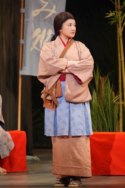 上野「菊姫を演じさせていただきました上野なつひです。今回、初めて明治座の舞台に立たせていただき、皆さんと共演させていただいております。加えて、産後初めての舞台でして、今は9カ月の息子がいます。最初は出演を悩んだ時期もありました。ですが、氷川さんとお芝居ができる機会は一生無いなと思ったので、家族にも協力してもらって出演を決めて良かったなと思っています。家族には申し訳ないですが、稽古場に行くのが毎日楽しかったです。氷川さんからの差し入れの 1 つに草団子がありまして、本当に美味しくて毎日買いに行っています(笑)。氷川さんには心は勿論のこと、胃袋まで掴まれてしまい毎日すごく幸せな気持ちです。お芝居では、氷川さんの歌に合わせて三味線を弾くシーンがあり緊張しているのですが、毎日新鮮な気持ちで演じさせていただいております。どうぞよろしくお願いいたします。」