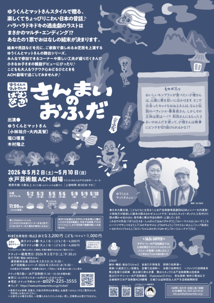 水戸芸術館で毎年ゴールデンウィークに開催され、絵本や民話などをもとに、ご家族で楽しめるお芝居を上演するゆうくんとマットさんの舞台シリーズ、5月上演。みんなで参加できるコーナーや楽しい工夫が盛りだくさんで、小さなお子様の観劇デビューにぴったりの作品。