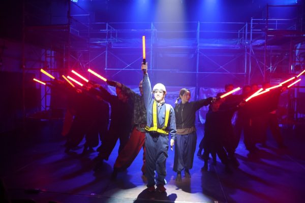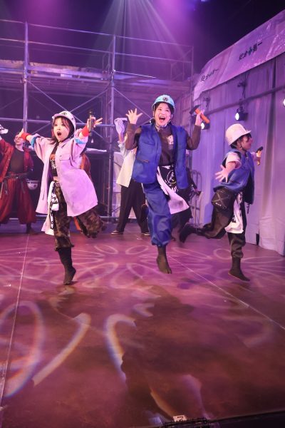 開演時間前から実は始まってる。劇場に行く途中の道にキャストさんがチラシを持って立ってたり。そしてロビーにも。開演15分前にはラジオ体操第一を。劇場が十分に温まったところで始まる。前列は指示があったらヘルメットをかぶる。盛り上がるところではオリジナルタオルを振り回したり、クラップも。最初はアイドルソング、初っ端から大盛り上がり。王道なメロディにラッキー池田と彩木エリのわかりやすい振り付けが親しみを感じる。そして始まるが、ミュージカルなので歌とダンス、パフォーマンスが畳み掛けるように繰り広げられる。若手主体のキャスト、そこにベテランが入っている構成。