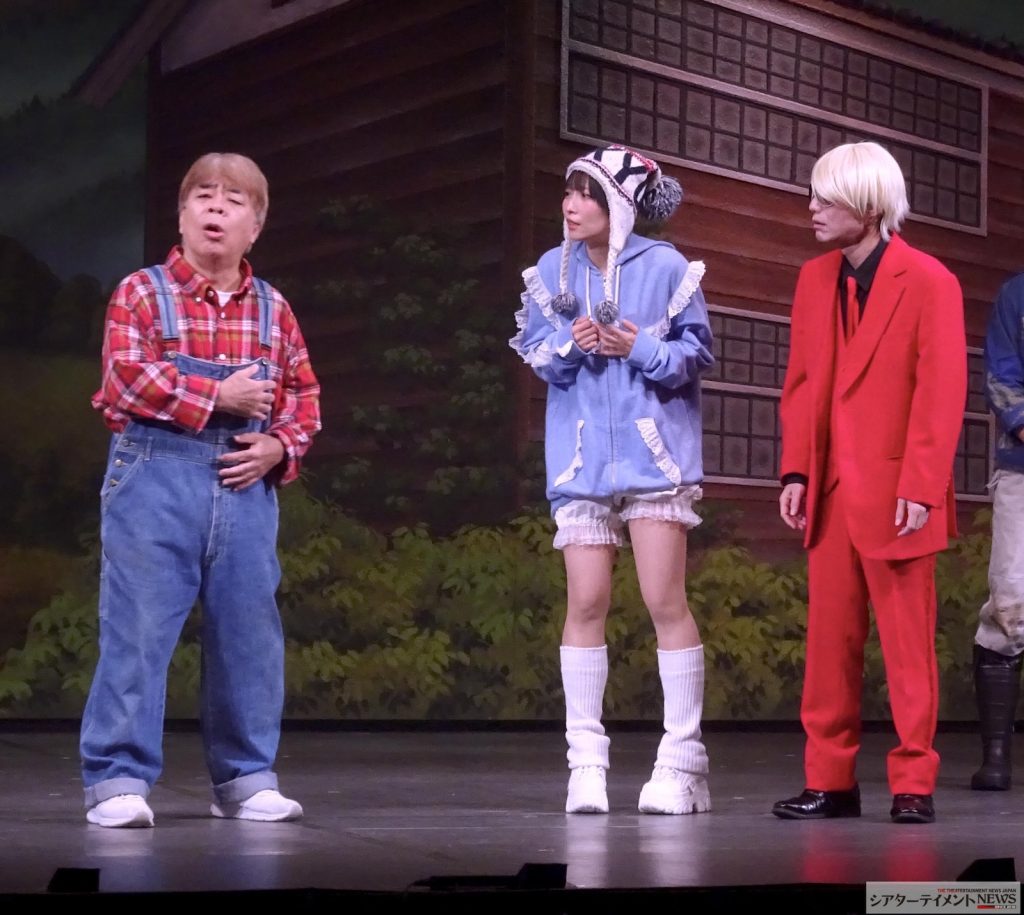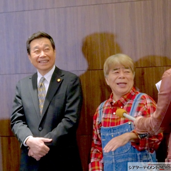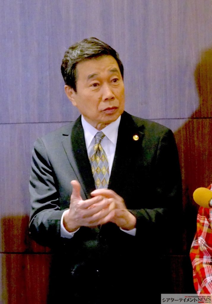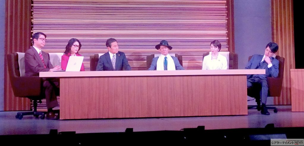 「私は、日本の官房長官の役をやります。政治家の役は伊藤四郎さんとの芝居でもやりましたが、あまりもういっぱいやつえちえもう何役だったかわからないです(笑)。今回は、劇団員が初めて本公演の脚本を書いたんですね。それが、ものすごいチャレンジでした。なかなか面白い脚本が上がったので、劇団員みんなが、舞台を良くしてやろうっていう気持ちで、まとまって、とてもいいチームワークになり、さらに良くなったと思いました。設定も奇想天外な設定でして、大体、奇想天外のところから、いいものを作ろうとすると、大体失敗するんですが、設定が想定外だからギャグが奇想天外にならないですが、今回は(手を叩いて!)うまくいっちゃいました。(ミュージカル•アクション•コメディと銘を打っていますが)、アクションなんかやったら倒れちゃいますね(笑)。