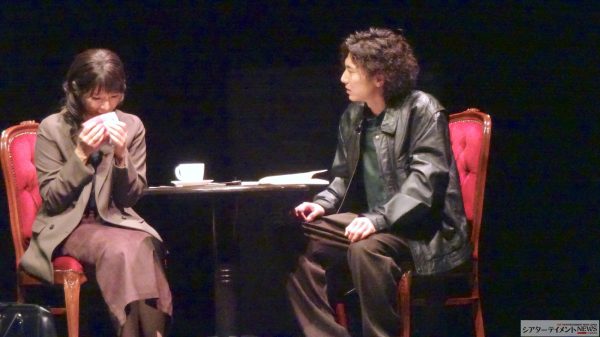 舞台の始まり、駅のアナウンス「新宿、新宿、ご乗車ありがとうございます」電車の音、場面は喫茶店、椅子が少々レトロ感あり、「亀山さん?」「初めまして」と挨拶。