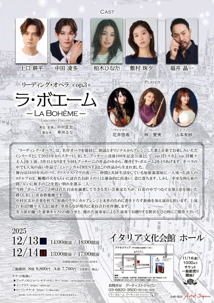 2025年12月13日(土)・14日(日) イタリア文化会館ホールにてリーディング・オペラOp.3『ラ・ボエーム』が上演。