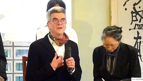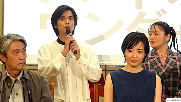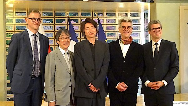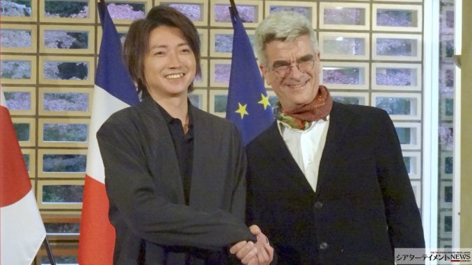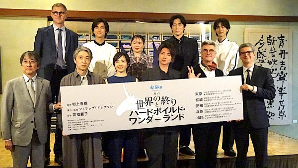 藤原⻯也「フランス大使館は初めてで嬉しく思います。村上春樹さんの作品は初めて。そして初めてのフランス公演、」世界的文学的作品をフランスの方たちに受け入れてもらえるような、海外の方々に受け入れてもらえるような芝居を作っていきたいと思います。フィリップさんは大変だと思いますけど、村上春樹作品は初めてですけど何とも言えない世界観、二つの世界が同時に進行して失ったものを一つ求めていくっていう作品なんですけれども、これを何とかフィリップスさんの期待に応えてですね、我々今必死に稽古していいものを作り上げていこうといいえております。皆さんおっしゃいましたけど稽古は始まったばかりで、まだ試行錯誤してるんですけれども、フィリップさんが稽古初日におっしゃってました。やはり良い舞台にしたい、いい作品にしたい、その一つの目標に向かって世界の人たちに届けられる、いい芝居ができるように頑張っていきたいと思います」