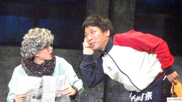 映画を観てたなら、お馴染みのシーンが舞台上に。出だしは、お約束感のある”もぎりのベテラン”、晝間あさ。映画では千石規子が演じていたが、ここでは意外な女優が(笑)。